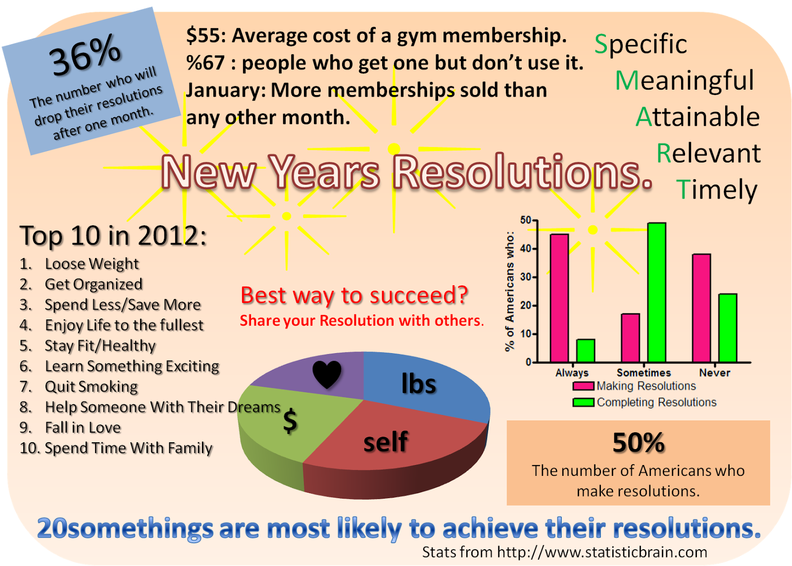 A 2013 Journal of Clinical Psychology study show that only 8% of people who make resolutions successfully achieve them. Also looking at the chart above, courtesy of statisticbrain.com, 36% of people who made resolutions in 2012 dropped them after only a month! In my humble and professional estimation, the reason for these failures is unnecessary and unwanted pressure to succeed and frame of mind. No matter what time of the year it is, the ability to embark on a fitness program is hinged on the state of mind of an individual. There are several stages we all must go through to determine readiness to become physically active. Whether its a scare in our lives or that of a loved one or a doctor’s recommendation or even not being able to play with our kids and grandchildren, something will trigger the need to exercise. More than anything else, mentally is the biggest challenge. At the end of the day, a person has to look in the mirror and say, “It’s time”. No doctor or personal trainer or even the commercial marketability of New Year’s Resolution will have a stronger impact than the mental aspect.